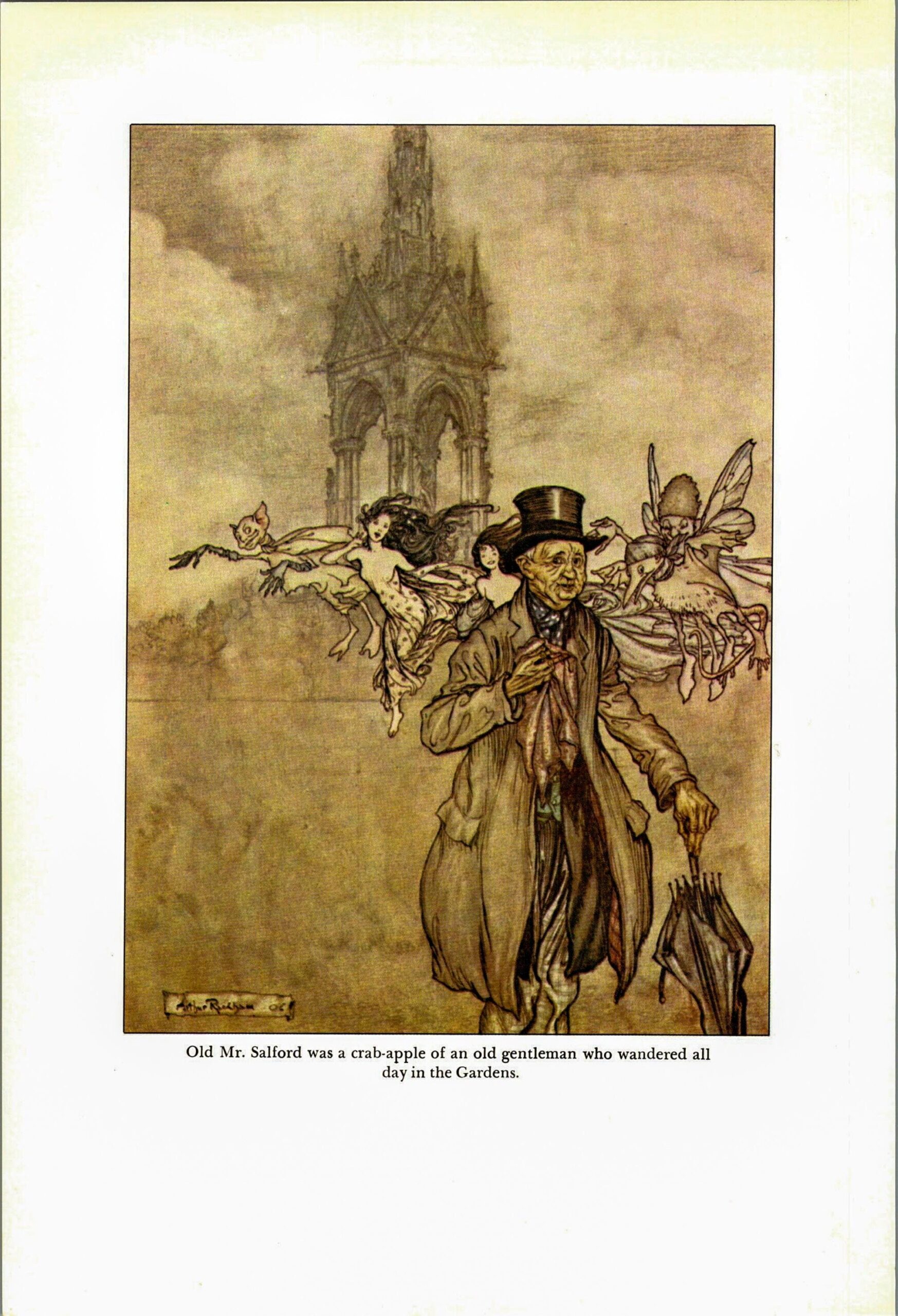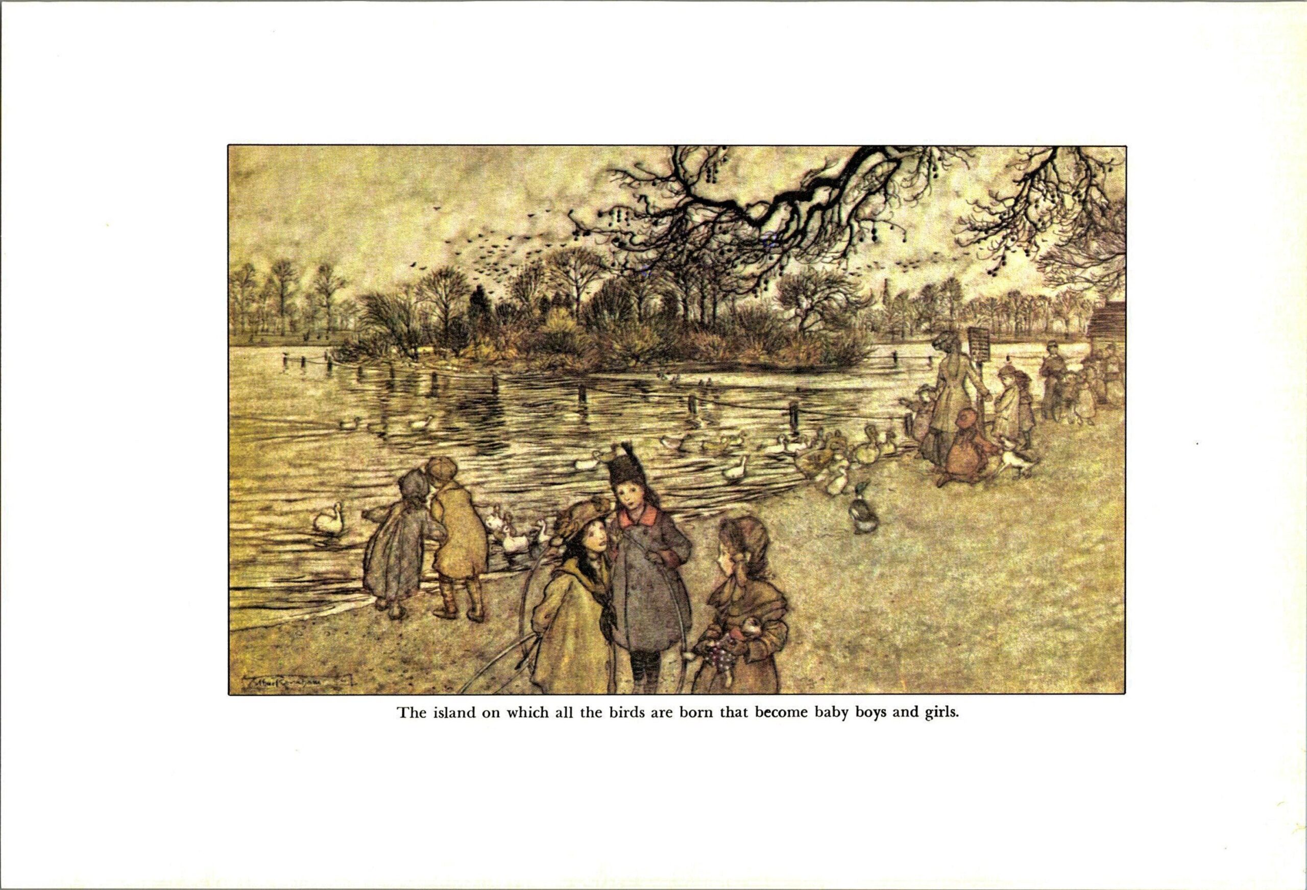 Arthur Rackham Vintage 2-sided fairy tale art book page “The island on which all the birds are born…” & “Old Mr. Salford” Peter Pan