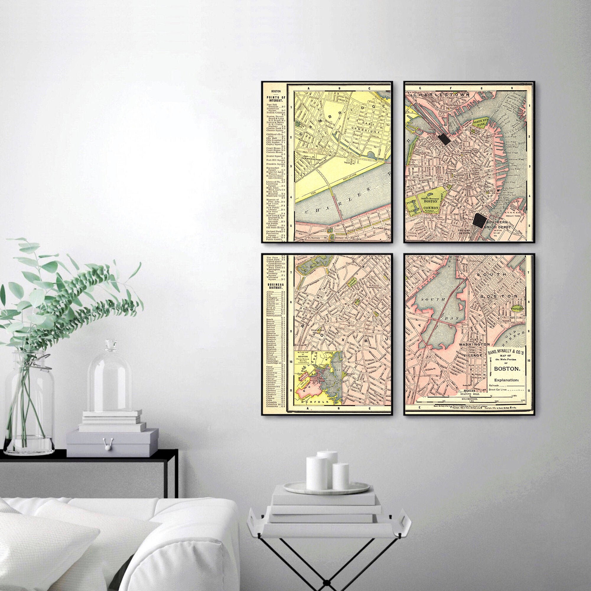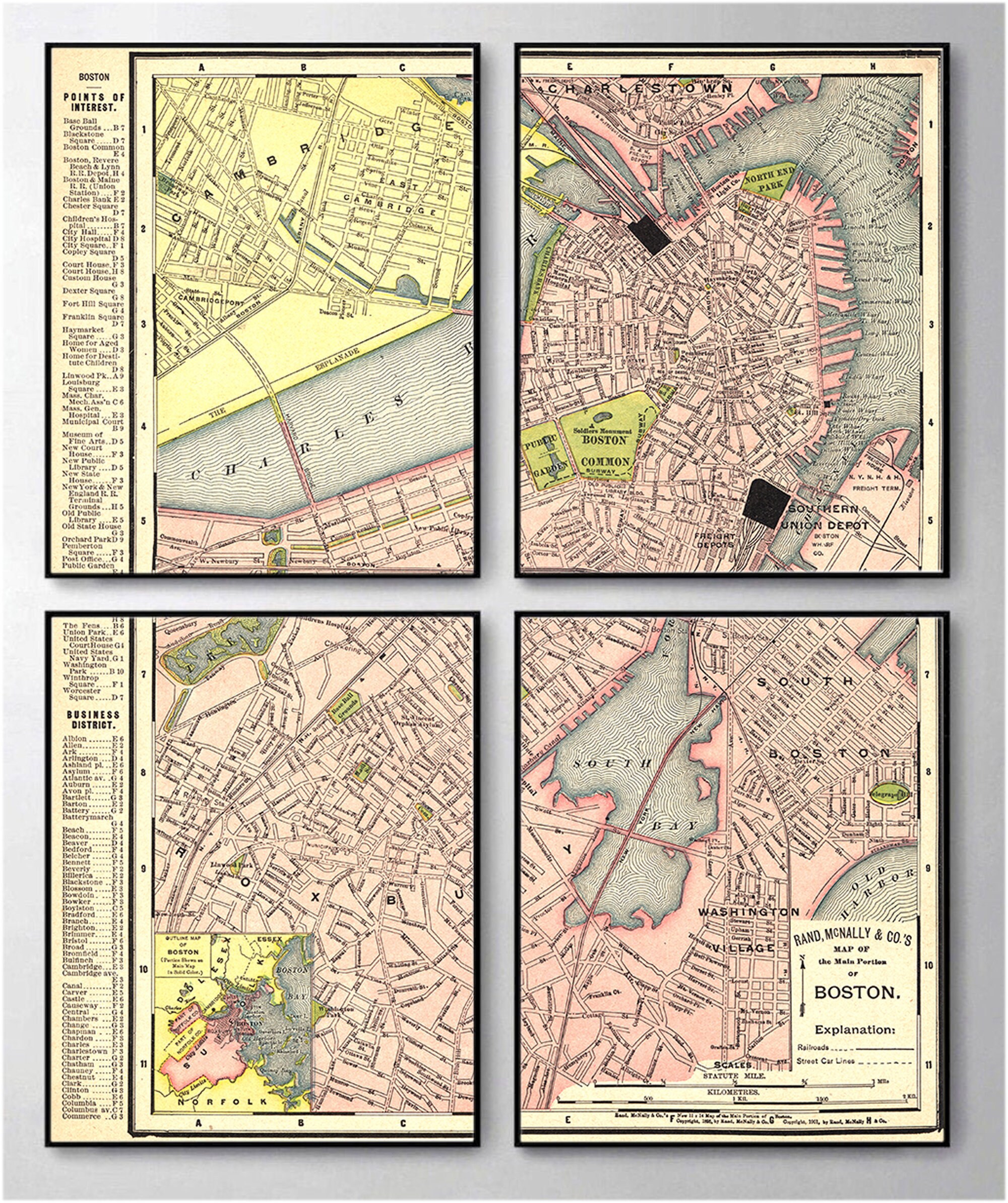 Boston antique map [1901] Quadriptych print Set of 4 8×10″ prints