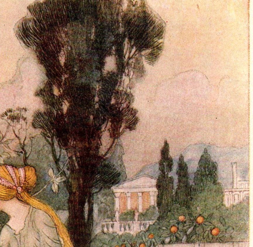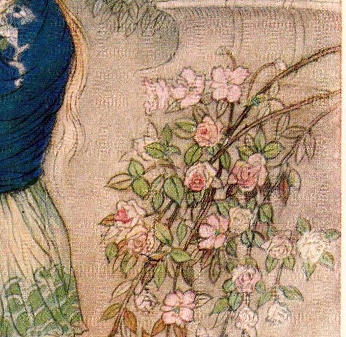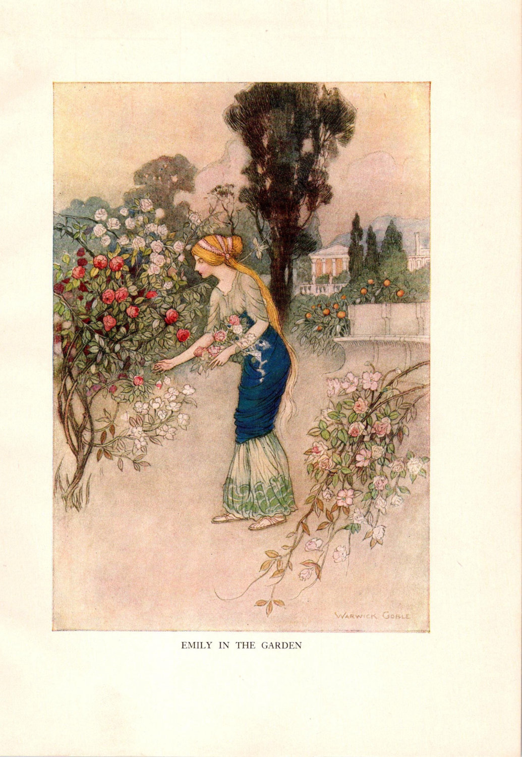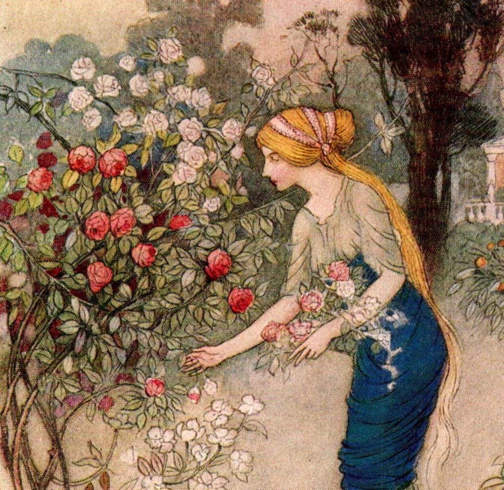 From Chaucer’s Works “Emily in the Garden” Vintage illustration by Warwick Goble 1930s