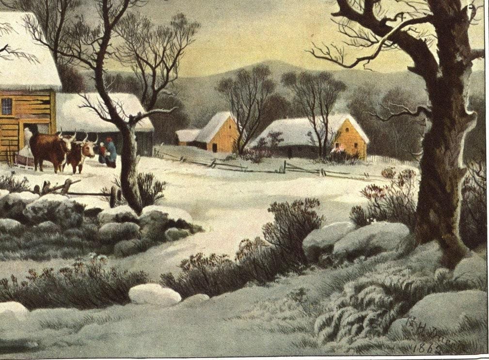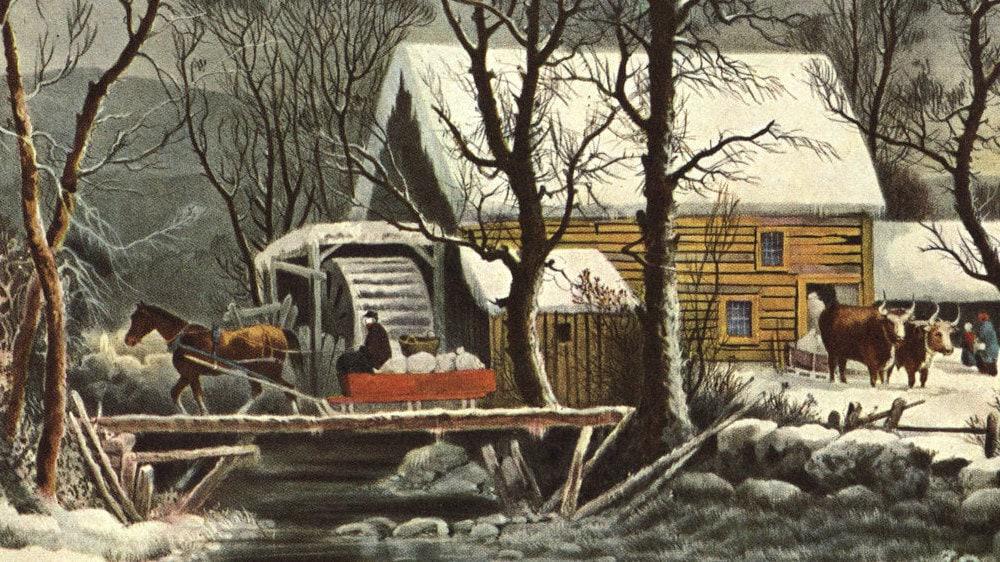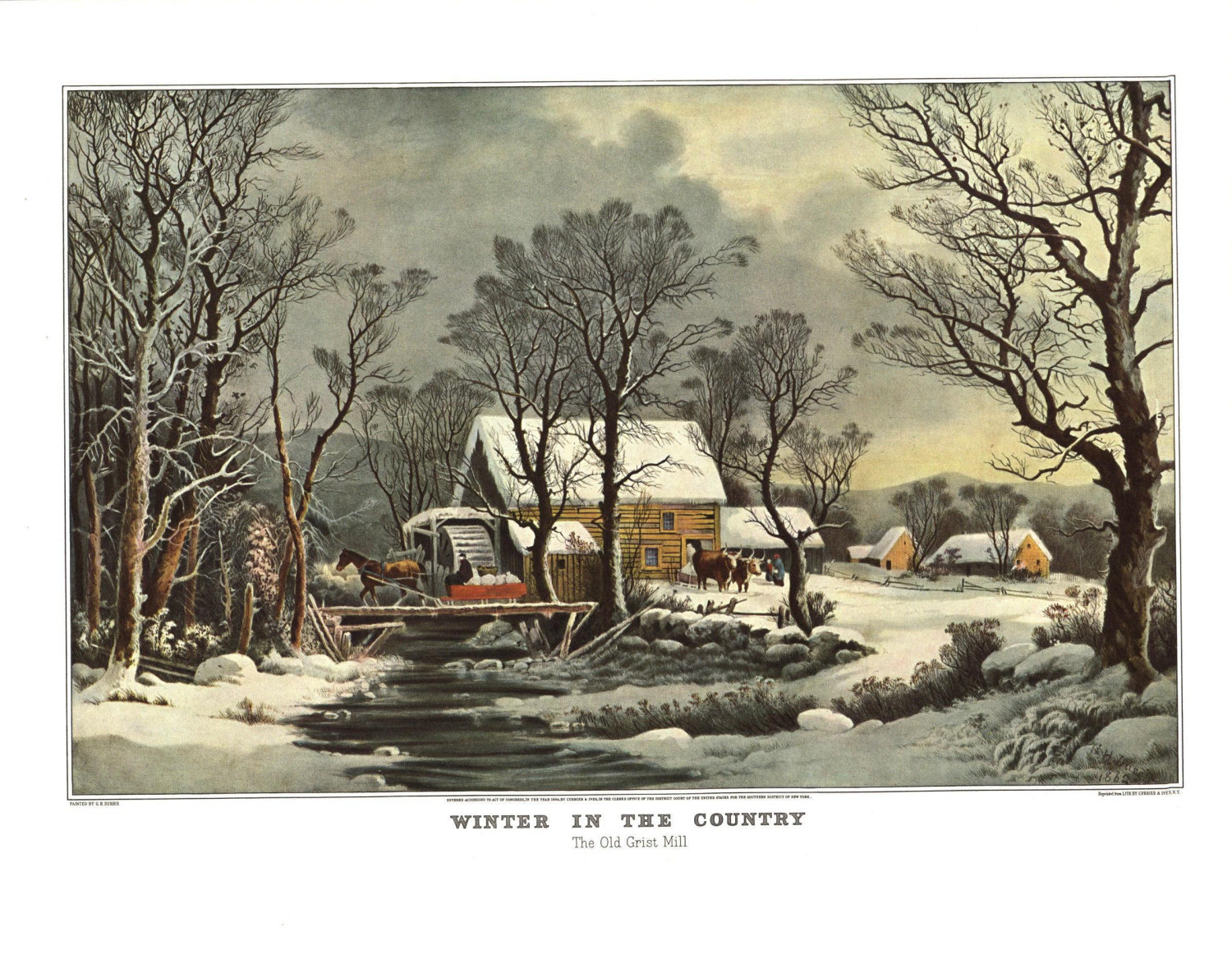 “Winter in the Country – The Old Grist Mill” originally published by Currier and Ives of New York City in 1864.