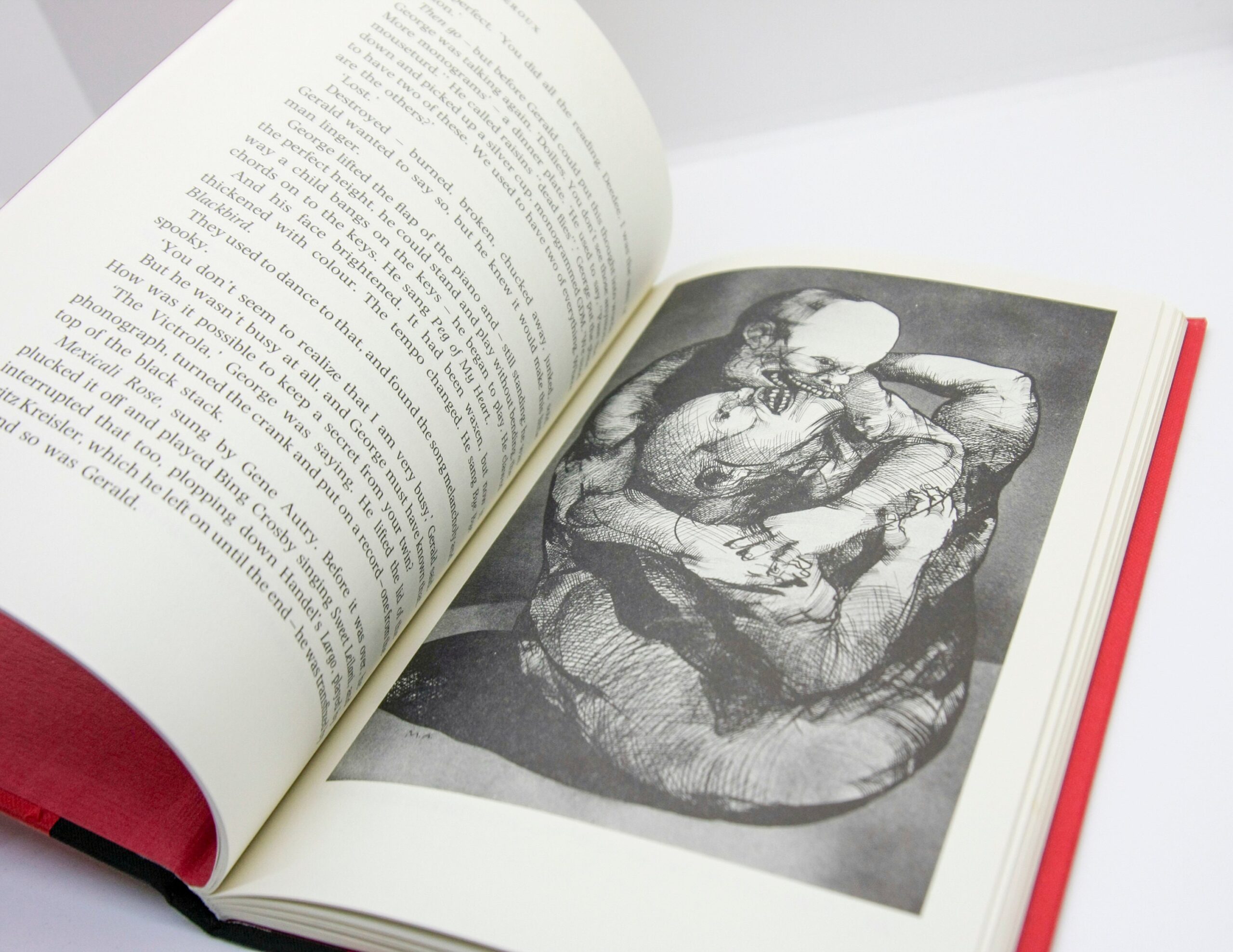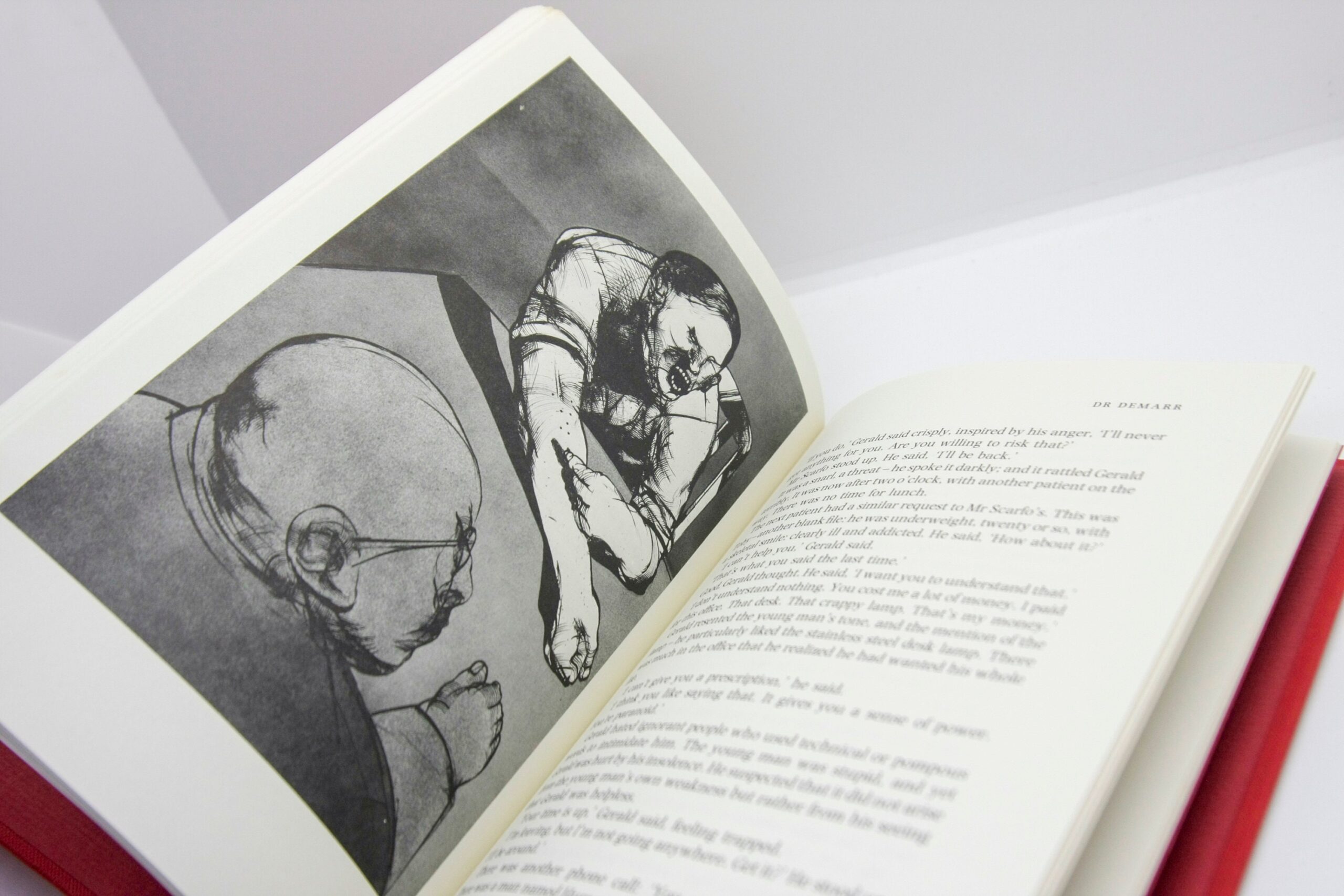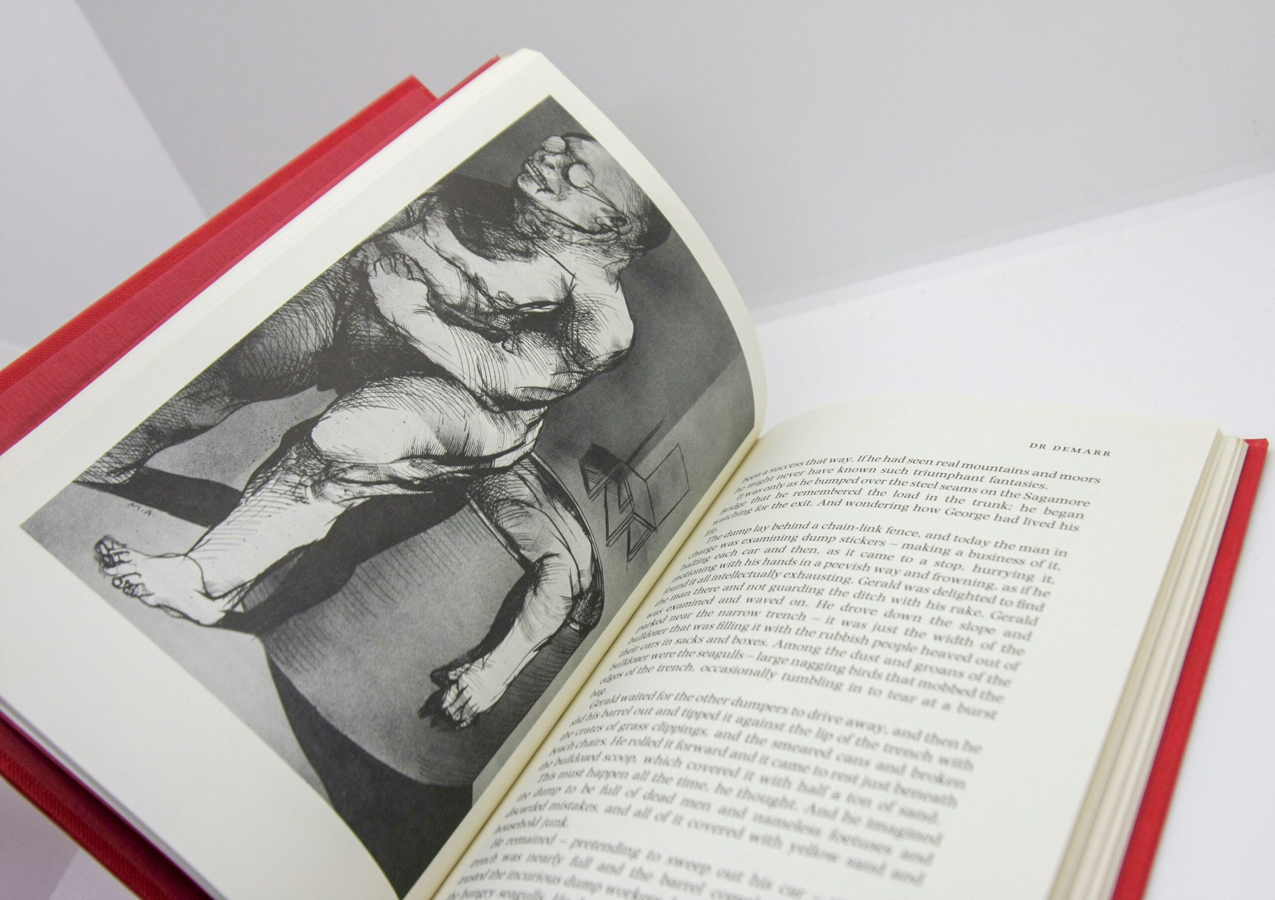 This is a “near fine” vintage hardcover in red paper wrapped boards and black cloth wrapped spine, gilt lettering on spine, published in 1990 in the UK by Hutchinson, 94 pages with several full page black and white depictions by Marshall Arisman.