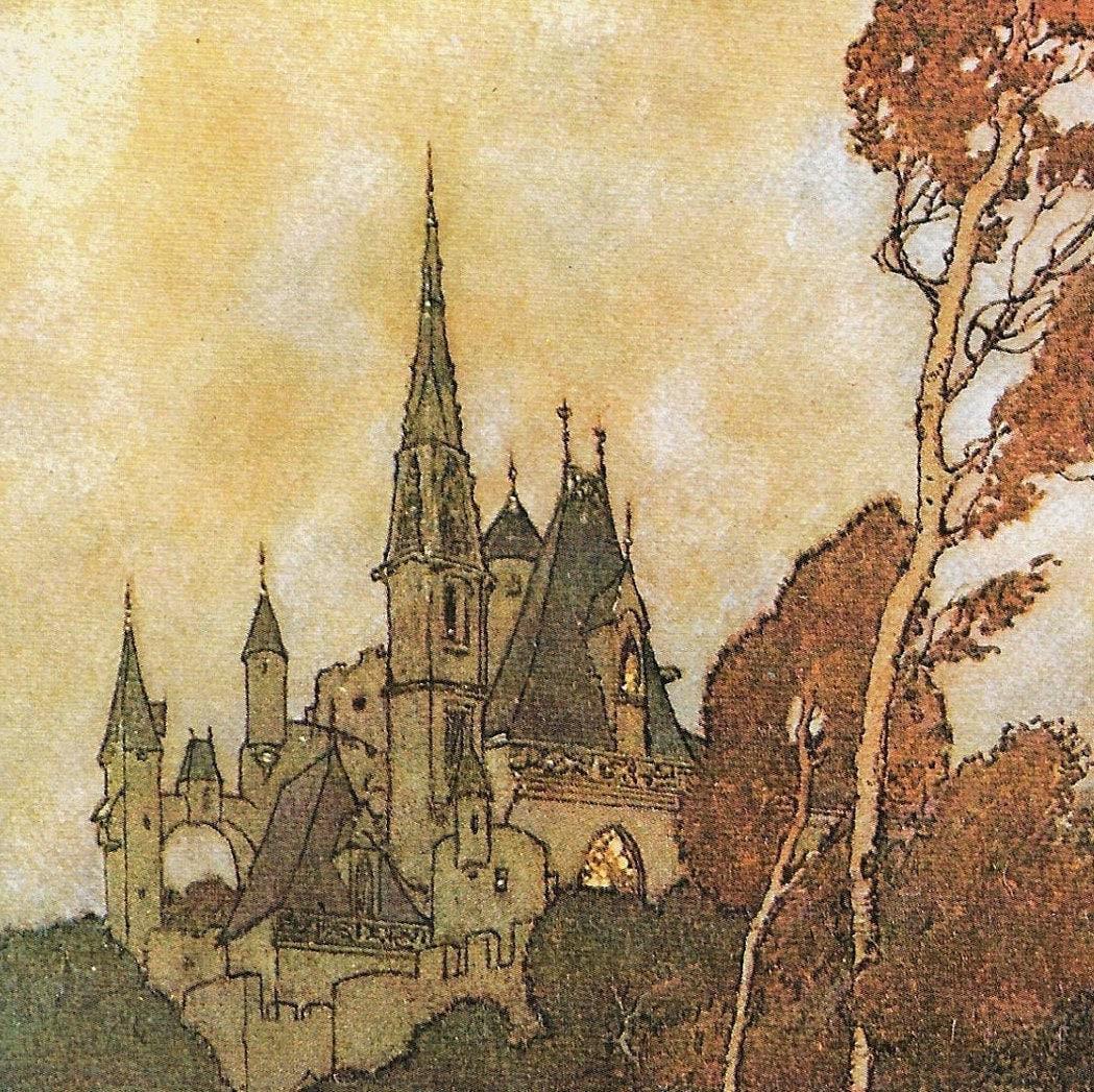 Vintage fantasy art book page Brian Froud “The Ogre built his manse high and lonely…” From The Sword of Thrac unpublished 1976