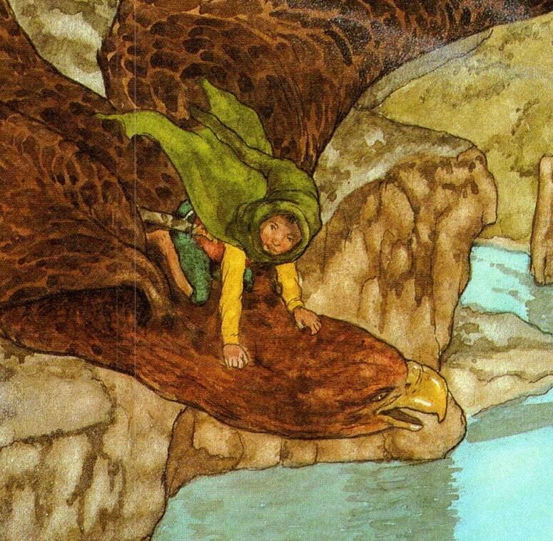 “This time he was allowed to climb on to an eagle’s back and cling between his wings.”