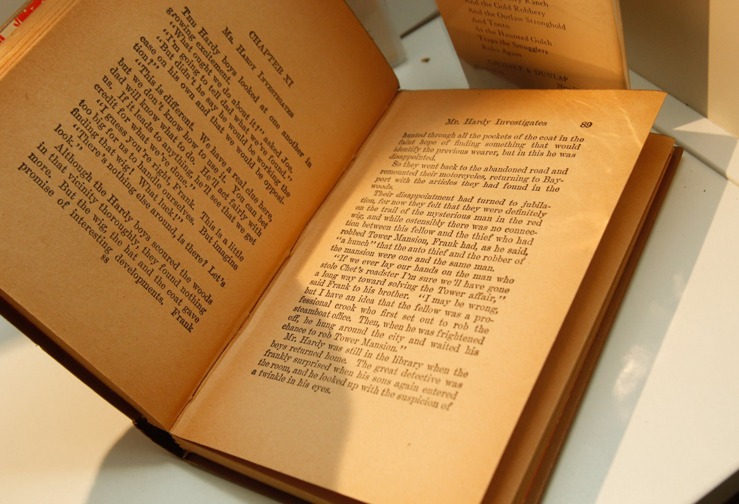 Identified by points as the “1946a-28” printing as per Carpentieri & Mular’s guide to identifying printings of the Hardy Boys books. The sixth signature of the book has been mistakenly bound with the sixth signature from an earlier Hardy Boys adventure – “While the Clock Ticked” – replacing pages 155-186 with the text of that story.