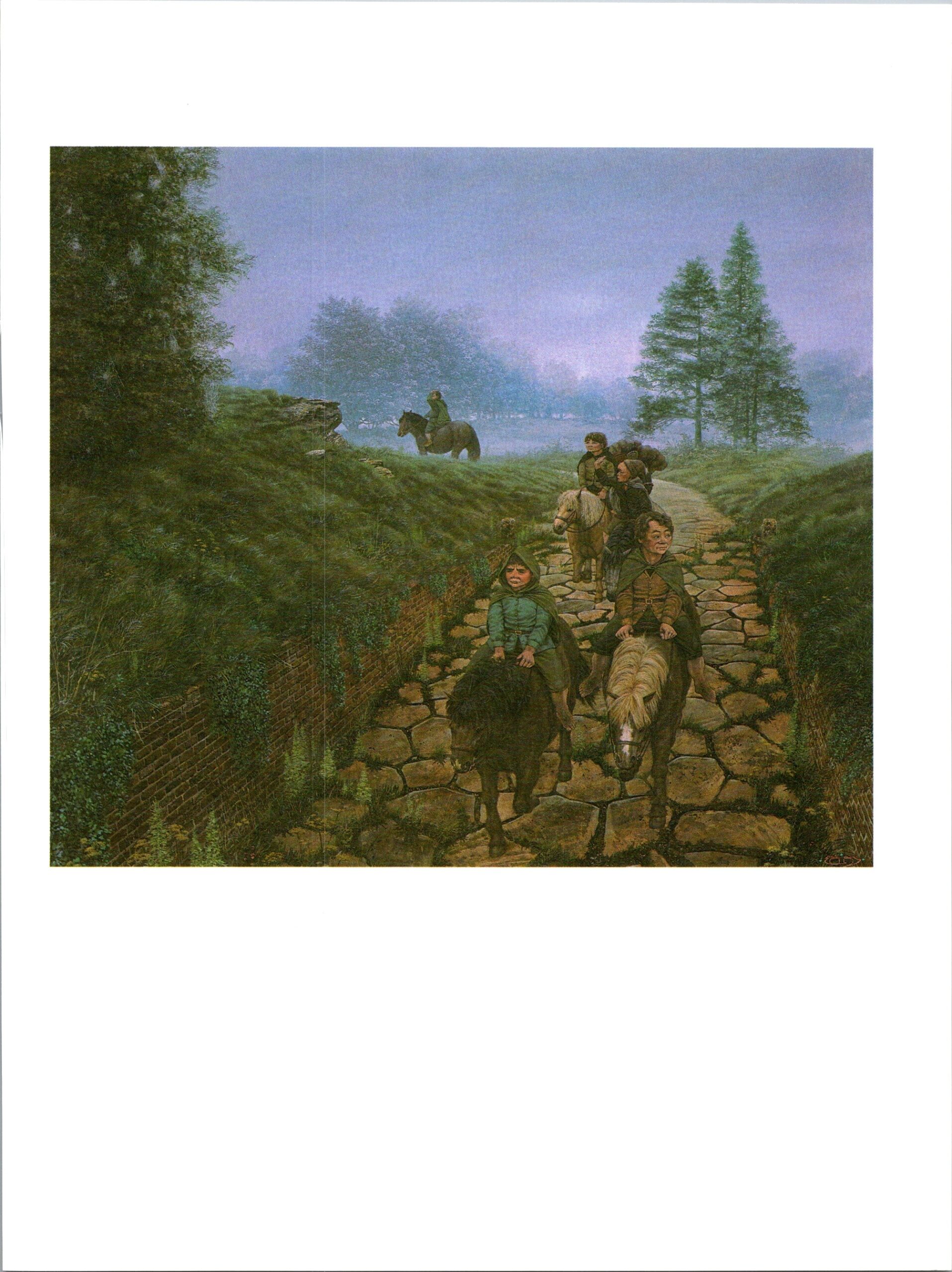 Leaving the Shire by Ted Nasmith from The Fellowship of the Ring Vintage art-book page