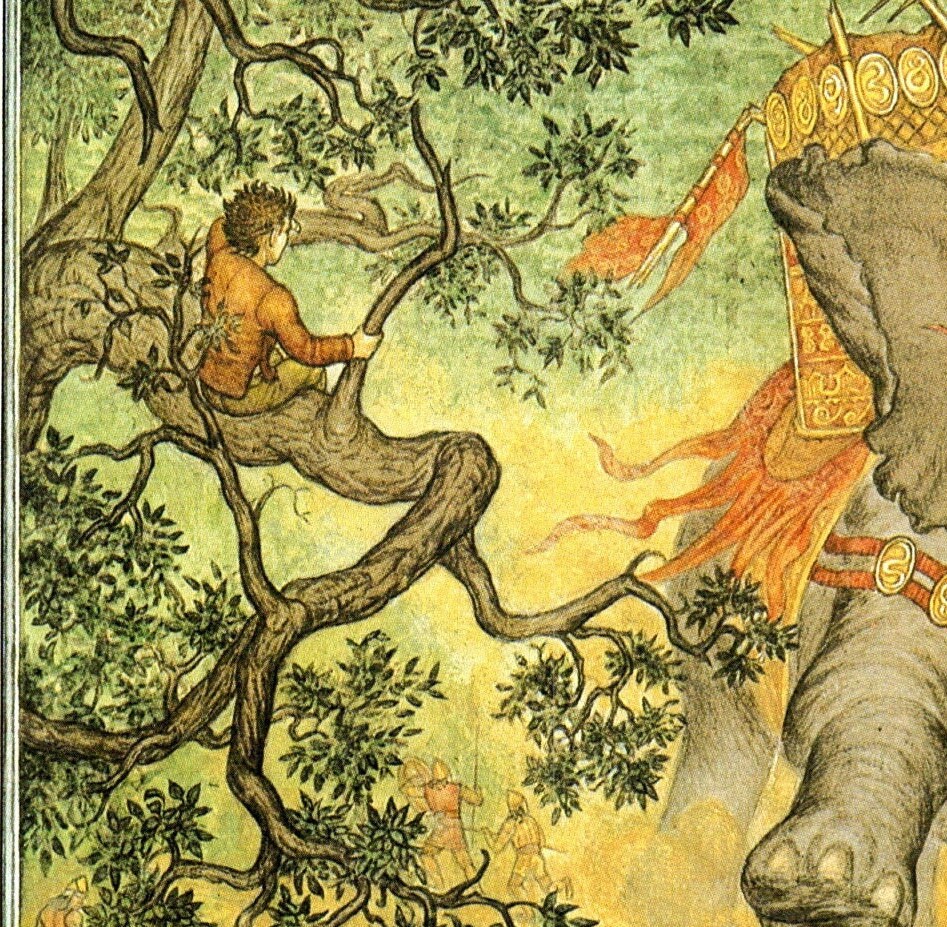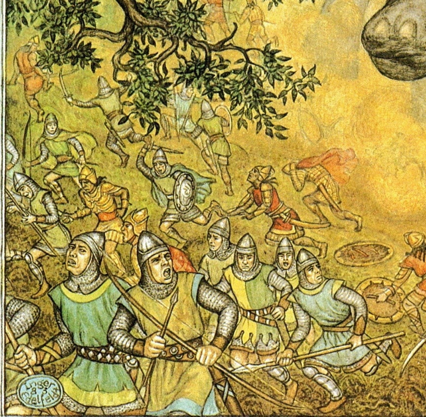 “To his astonishment and terror, and lasting delight, Sam saw a vast shape crash out of the trees and come careering down the slope.”